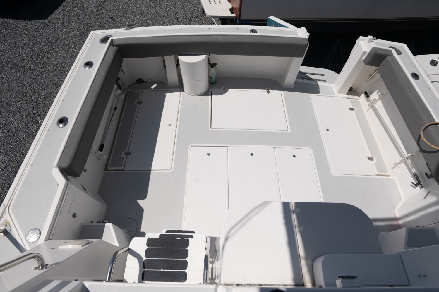 Starting forward there is a centerline queen bunk with storage underneath. The forward cabin is exceptionally large and has a vanity with a pull out makeup stool to port and an enclosed head with a separate shower stall to starboard. A wide oak trimmed bi-fold door provides full privacy for the master cabin. The galley is located on the port side of the main salon and has a propane range with twin Norcold refrigeration units. Custom features like the built in coffee maker and additional shelving are just a few of the custom touches found aboard. A large U shaped settee with a drop leaf table is to port. The table has the ability to lower and form a double bunk. Storage abounds on the Albin 32 and there are draws and cupboards located throughout the vessels interior. Three short steps lead to the after deck. There is a “tuna” door for easy access to the swim platform, a feature that makes boarding the vessel easy and safe from either a dinghy or the dock. Access to the fly bridge is gained by ascending a short stainless steel ladder. The fly bridge has a padded helmsman’s chair with varnished armrests and there is a u shaped settee to port. The albin 32 has wide side deck which makes going forward easy and safe. An electric windlass with an anchor roller and large hatches for the anchor locker makes setting and retrieving the hook a one person job.